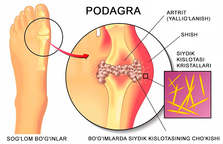 Qo'shimchalarda siydik kislotasi kristallarining to'planishi yuzalar barcha patologiyalarning asosiy sababidir.
